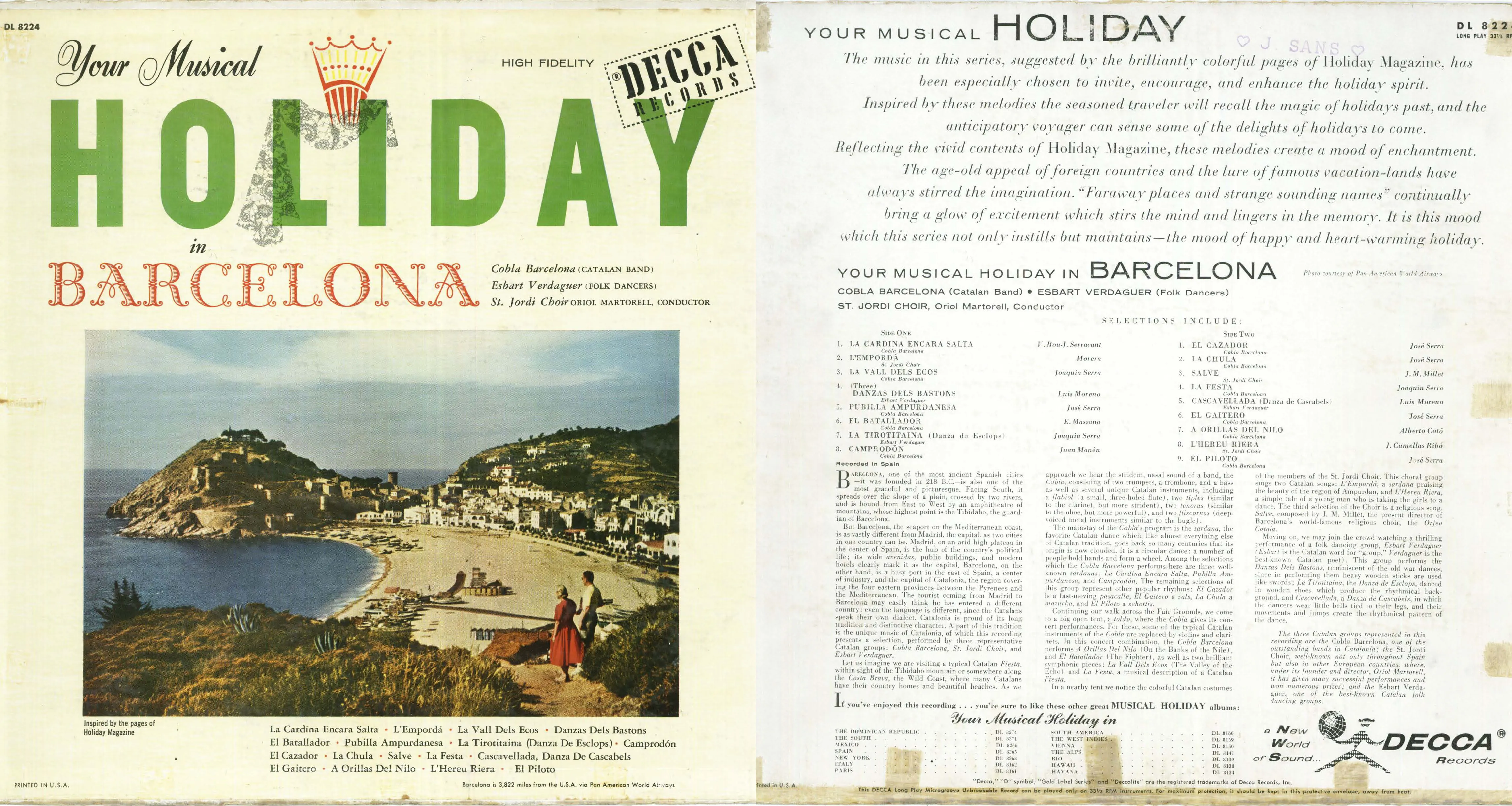 | Your Musical. Holiday in Barcelona | 0 | 01/01/1956 | DECCA DL 8224 i DECCA ED 408 | Cobla Barcelona, Coral Sant Jordi i Esbart Verdagu... | El piloto | Serra i Bonal, Josep | Barcelona | 19 |
