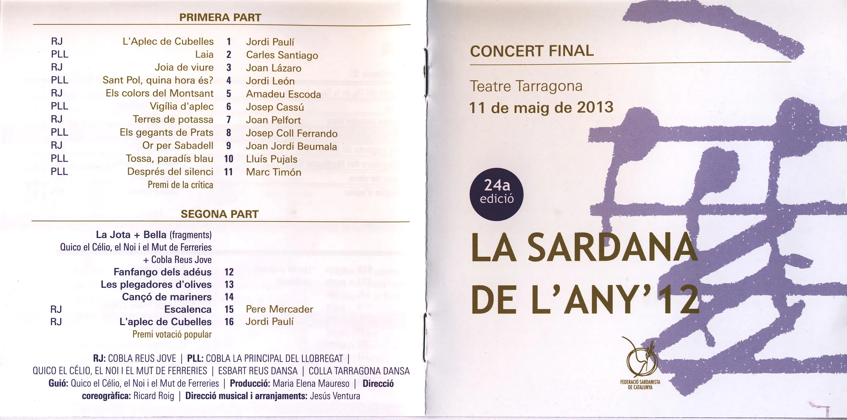 | La Sardana de l'Any | 24 | 11/05/2013 | DupliCat 000P8064$1 | Reus Jove i Pral. Del Llobregat | Tossa, paradís blau | Pujals i Carretero, Lluís | La Principal del Llobregat | 10 |