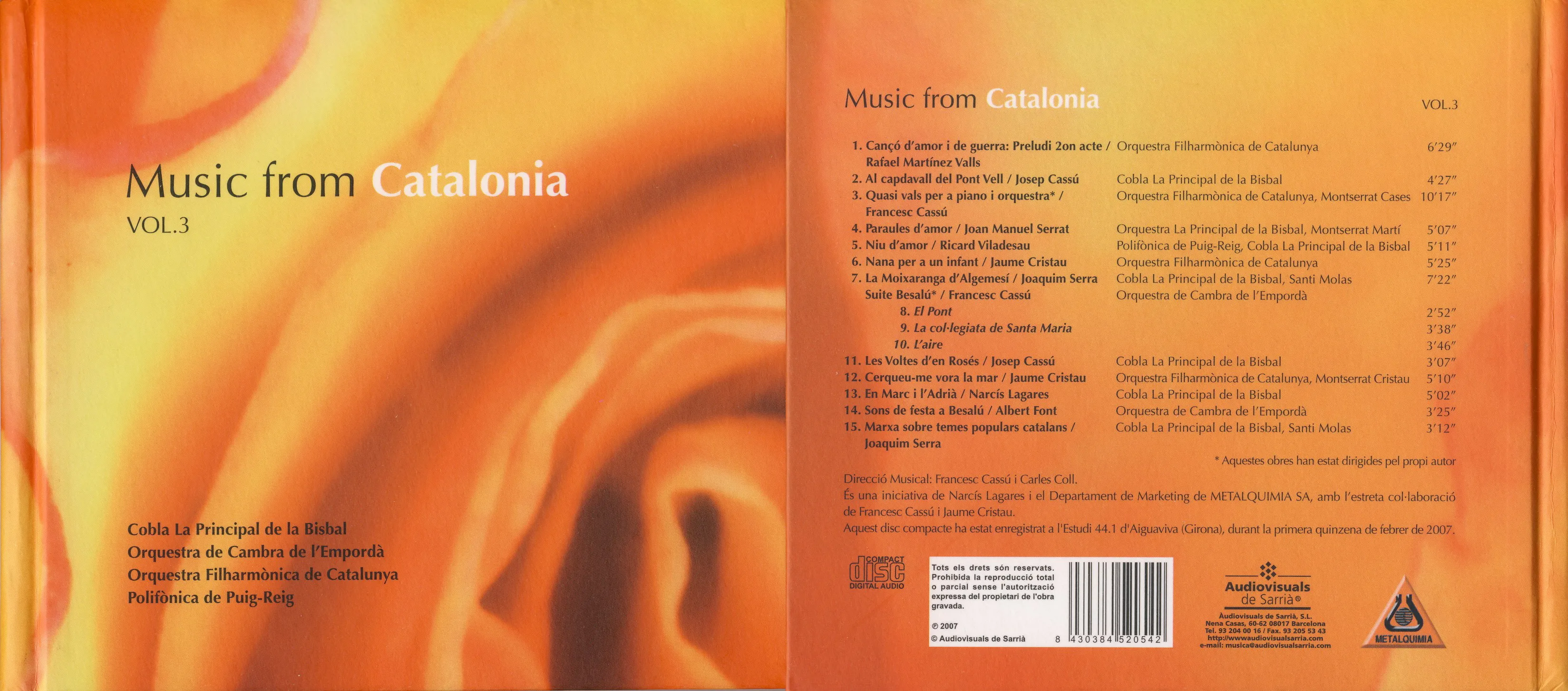 | Music from Catalonia | 3 | 01/01/2007 | AVS 5.2054 | Pral de la Bisbal, Cambra de l'Empordà, Filarmònic... | En Marc i l'Adrià | Lagares i Corominas, Narcís | La Principal de la Bisbal | 13 |