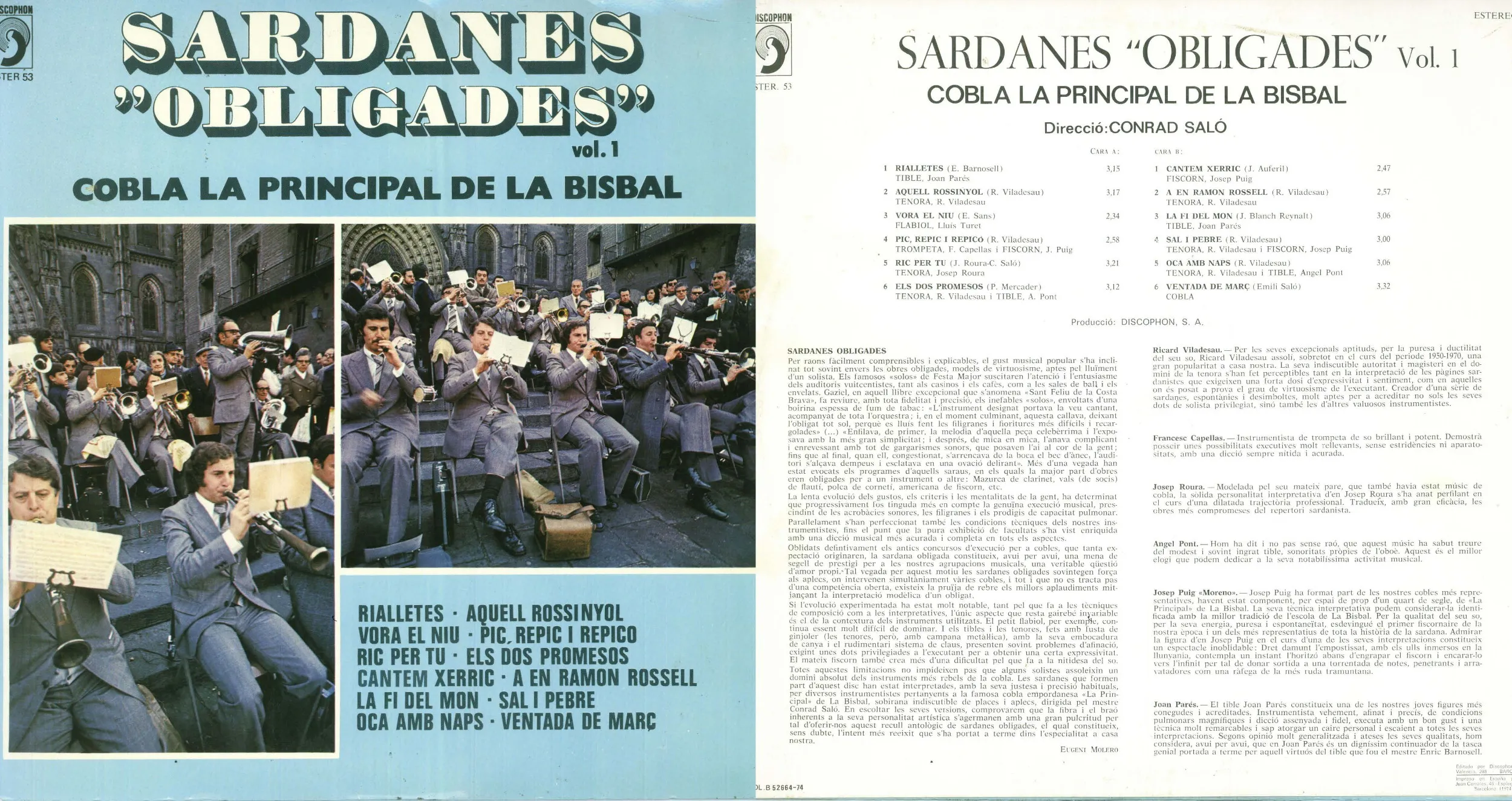 | Sardanes obligades 1 | 14 | 01/01/1974 | DISCOPHON STER 53 | La Principal de la Bisbal | A en Ramon Rosell | Viladesau i Caner, Ricard | La Principal de la Bisbal | 12 |