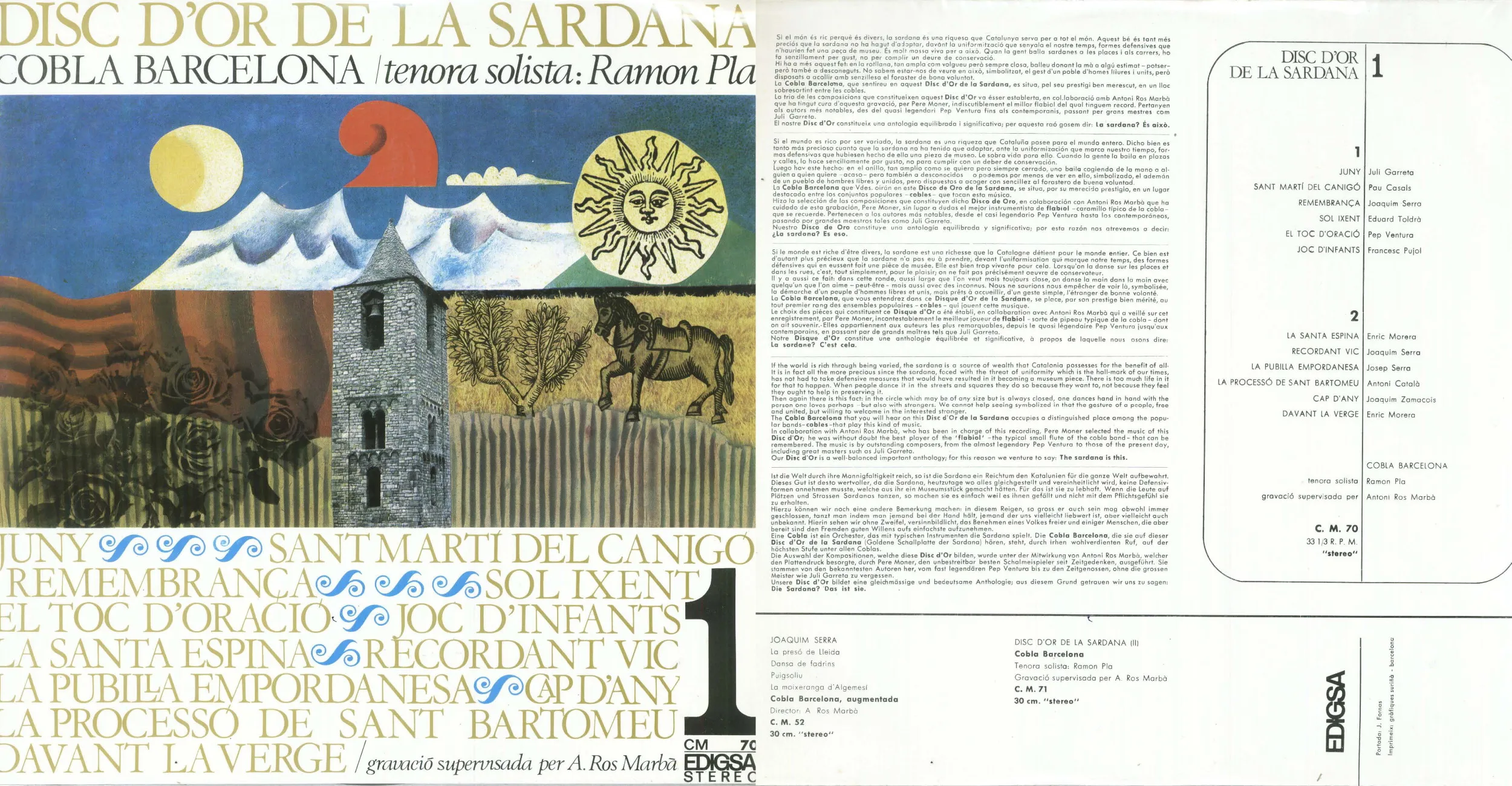 | Disc d'or de la sardana (1 i 2) | 1 | 01/01/1965 | EDIGSA CM 70 i PDI 80.2643 | Cobla: Barcelona, tenora: Ramon Pla | La processó de Sant Bartomeu | Català i Vidal, Antoni | Barcelona | 14 |